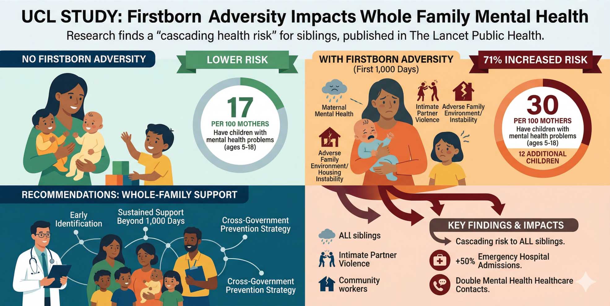 The first-of-its-kind study, published in The Lancet Public Health and funded by the National Institute for Health and Care Research Policy Research Programme, found that mothers whose firstborns had experienced adverse childhood experiences had a 71% increased risk of having children (aged five - 18) with mental health problems, compared to mothers whose firstborn did not experience adversity.